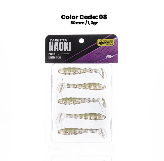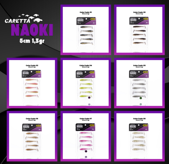 Caretta Naoki silikon yem, avcı balıkların dikkatini çekmek ve etkili bir avlanma sağlamak için özenle tasarlanmıştır. Yumuşak yapısı, detaylı tasarımı ve üstün hareket kabiliyeti sayesinde, hem tatlı su hem de tuzlu su avlarında en verimli yem seçeneklerinden biri olacaktır.
