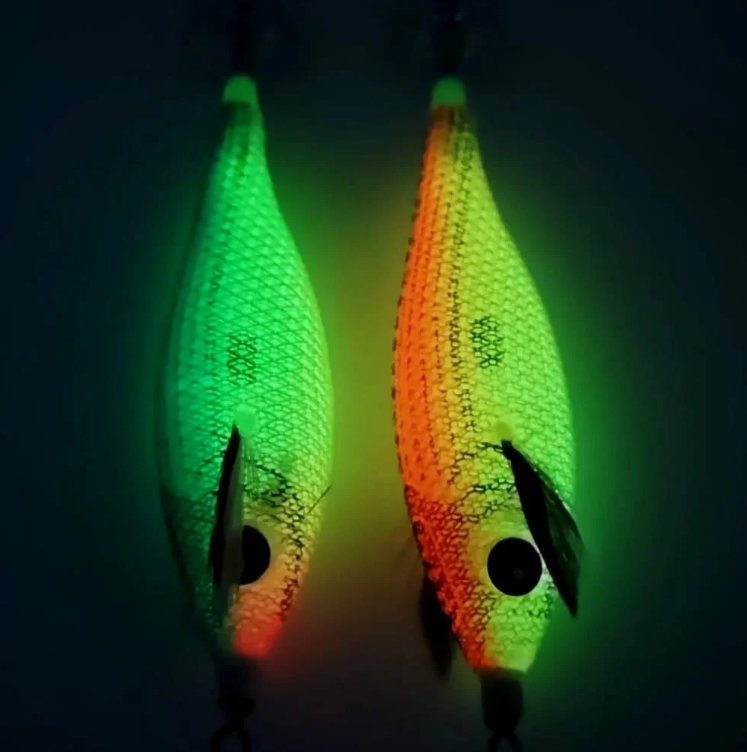 Floresan renkli parlak sık dokulu keten balık pulu benzeri kumaş kaplama glow gövde tasarımına sahip kalamar zokası.