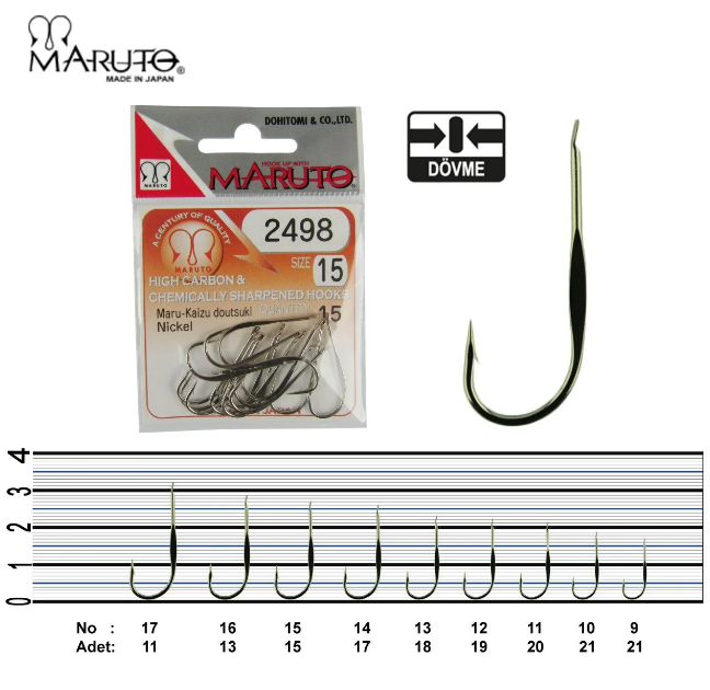 Maruto 2498 İğneleri Nikel (Beyaz) renk seçeneğine ek olarak düz uzun pala ve yanaklı sap yapısıyla ön plana çıkıyor. Özellikle Sargoz ve Çipura gibi dişli balıkların iğneyi kıramaması için tasarlanmıştır.Nikel alaşım çelik olması ile ani dirençlere karşı dayanıklılık gösteriyor.