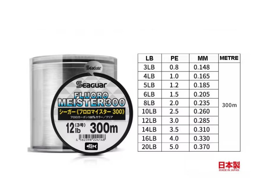 SEAGUAR Fluoro Meister fluorocarbon, piyasaya sürüldüklerinden bu yana performans ve güvenilirlik açısından sağlam bir üne kavuşmuştur. Tüm bu fluorocarbonların ortak özelliği, kırılma indekslerinin neredeyse suyla aynı olması ve suya batırıldıklarında neredeyse görünmez olmalarıdır. Çaplarına kıyasla kopma gerilmeleri son derece güçlüdür, ayrıca iyi düğümlenirler ve yorulmaya karşı yüksek direnç gösterirler. Her 75 metrede bir bobinde kaç metre kaldığını gösteren etikeler bulunmaktadır. Taşıma ve koruma plastik tüpü dahildir. JAPONYA'da üretilmiştir